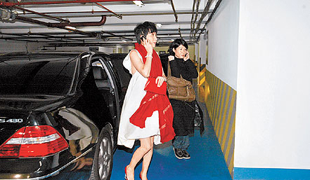 欢唱结束,刘嘉玲(左)搭郭台铭的车回西华饭店,边走边讲手机。