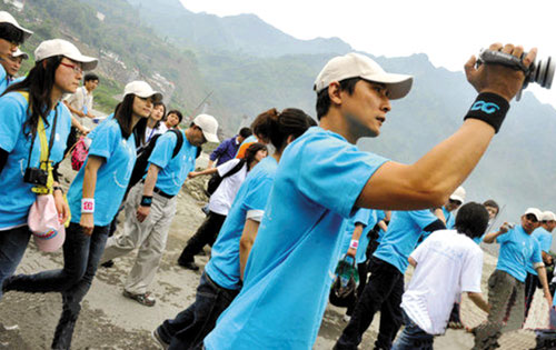 到了牛眠沟终点后,众明星纷纷跟随李连杰登上之前已搭好的舞台,完成最后的仪式。来自映秀的羌族妇女为李连杰挂上了蕴含着祝福之意的羌红。这时,主持人宣布当天共有一百万网民通过网络进行了虚拟行走,以此支持“壹家人,壹起走”活动,并现场成立了“志愿联盟”。最后,在李连杰的带领下,全场200多人默哀一分钟,以表示对逝者的怀念。(王尚)