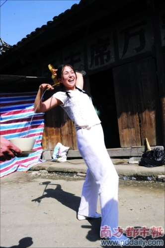 当天拍摄的戏份讲述茶馆小妹安雅在屋内练习耍长嘴壶的手法,被疯子郭涛从窗外看见,由远至近靠近安雅,要指点她,最后贴身辅导的一段戏。据陈果介绍,这段戏是片中最重要的一场感情戏,也是两人擦出感情火花的瞬间。