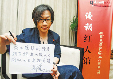2009年两大春晚红人之一——刘谦,来到钱报红人馆做客了。坐在本报记者面前的沙发上,遭遇到“近景魔术是否将如同选秀一样走向死亡”这样并不令人愉快的话题,刘谦连眉毛也不跳一下,依旧保持着他典型的职业化的笑容,胸有成竹地拆招:“就算选秀死了,不代表将来人们就不唱歌了,魔术同样是不可缺少的。其实,我根本不担心这个问题。”