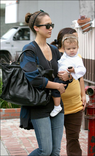 杰西卡.阿尔芭围巾装束出游 哄女开心扮鬼脸(图)