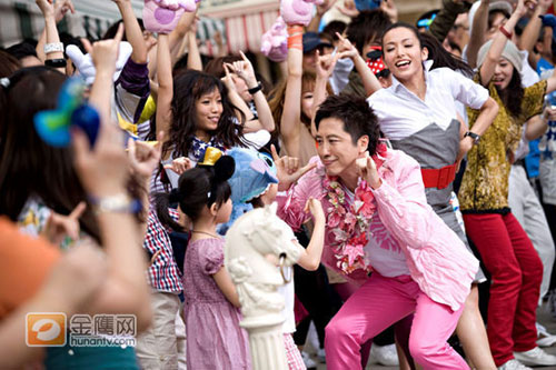 图文:庾澄庆一身粉红携卡通公仔闹市跳热舞(2)