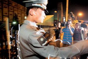 今晨3时,一辆警车开出大门右拐弯之后停在了便道上。两名保安下车后,打开后面的铁栅栏门,放出两男一女。早已疲惫的记者们顿时从门口的台阶上跳起来,跑到警车后面,闪光灯闪个不停。