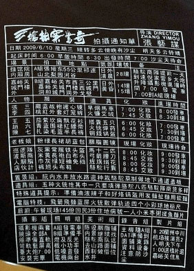 记者从这份泄密的拍摄通知单上发现:今天拍摄的将主要是张三(孙红雷)和李四(小沈阳)之间的对手戏,其余人物还有王五、赵六以及陈七、老板娘、巡逻队、波斯商、人胭脂、店伙计。拍摄道具则包括旱烟、马车、火镰、搭囊、火筒弹药、弓箭、腰刀等,另有骆驼以及马12匹。看来今天拍摄的大部分都是外景。有意思的是,这张拍摄通知单上还有一条“特殊道具提示”:油泼辣子、烙锅盔用发面,扯面用软面。而午餐现场是145份,说明这个剧组规模还是不小。细心的工作人员还注明:“住地病号一人:小米枣粥搓鱼面片。”看来之前所传剧组伙食不错的消息果然不假。