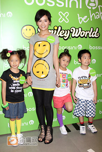 蔡卓妍一身活力的装扮,为代言的服装站台,与小朋友十分亲近。