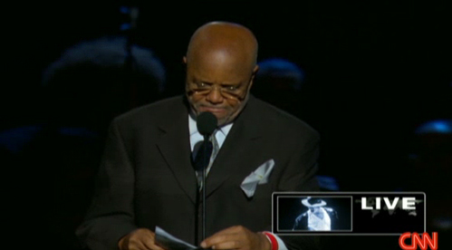 中新网7月8日电 CNN消息,摩城创始人贝利.戈蒂正在杰克逊的公众追思会上致辞。他致辞中说,杰克逊的歌声中有热情也有灵魂,非常特别。并回忆了杰克逊5人组的出道和走红的经历和往事。他称杰克逊歌曲中的悲伤和疯狂,也是他人生的写照。