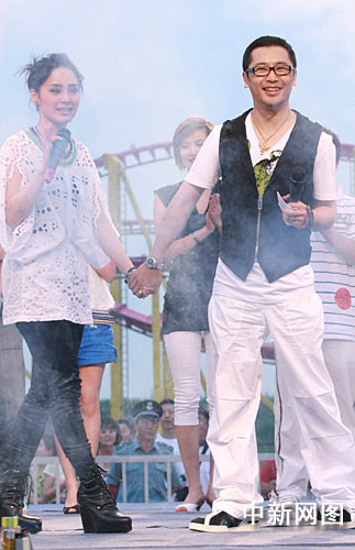 7月12日,阿娇(钟欣桐)来到哈尔滨冰雪大世界欢乐嘉年华歌手比赛现场,和哈尔滨快乐女生同台演唱。节目演完后阿娇坐敞蓬跑车在嘉年华现场巡游一圈,和粉丝们零距离接触。 中新社发 姚庭山 摄