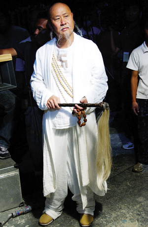 造型:一身白袍,加上白头发白胡子,再挂一串菩提子,这个意境十足的装扮只需花五分钟———此乃现场记者亲自验证。刘镇伟为人宽容,记者凑着他猛拍也不介意,还叫化妆师把帘子拉开,别把大家热坏了。