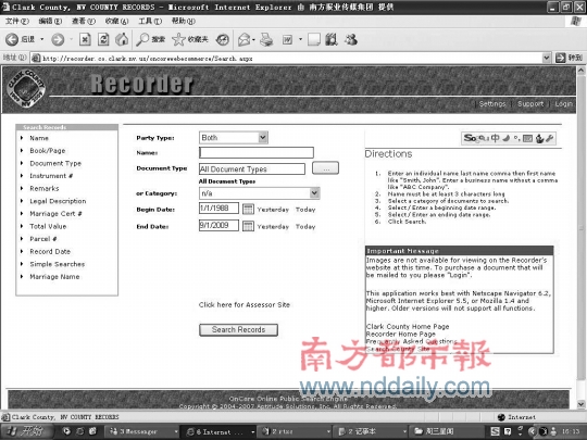 据记者的查证发现,其实这个名为内华达州克拉克县公共搜索引擎的网站内容不仅仅包括结婚证明,还包括出生死亡证明、离婚证明、兵役证明等。