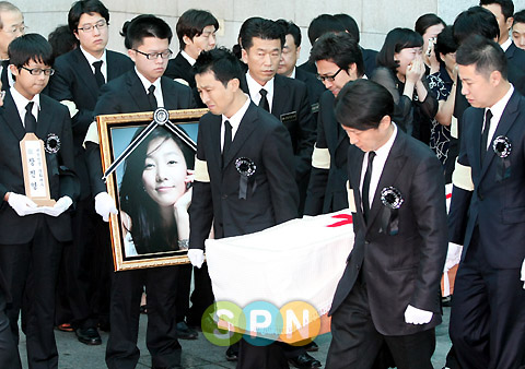 中新网9月4日电 “朝鲜日报”消息,电影演员张真英的出殡仪式4日在首尔峨山医院庄严举行。张真英的侄儿手捧着她的遗照,引领灵柩离开灵堂。众多圈内好友前来送她最后一程。