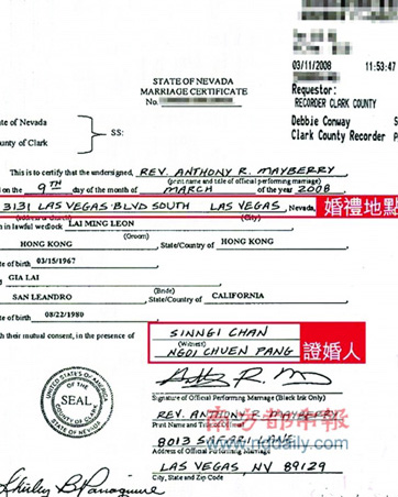 被曝光的华仔与朱丽倩的结婚证书上写着:注册结婚仪式是在赌城一间教堂内举行,由华仔助手Eden及一位名叫MeeChockMaryYeung的人士见证;登记地址则是写着华仔天地的会址,可见华仔对歌迷感情之深。(小美)