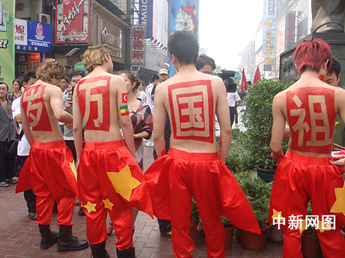 在湖南长沙闹市黄兴南路步行街,许多路人围聚在一起。5名自称“乐淘族”的90后男女,身上被涂彩绘,发型另类,穿着国旗裙裤,背上分别写着“祖国万岁”四个字,在这里搞爱国主题的行为艺术。他们还热情地给路人派送自制的红色传单,红传单上印有他们自己创作的“时尚潮歌”《乐淘族》歌词。