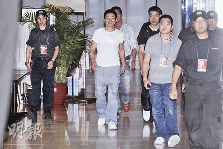 生日聚会结束后,华仔由保安护送离开会场,他见传媒面带笑容