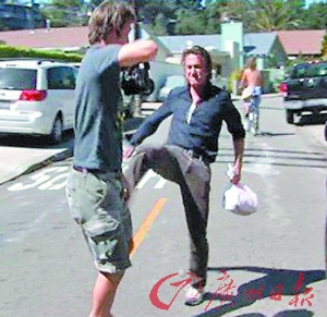 早已有打“狗仔队”前科的奥斯卡影帝西恩·潘当天被拍到在洛杉矶某餐馆吃完午餐后,因不满被一名记者拍照而向他动粗。照片中清楚见到他起脚踢向该名“狗仔队”,据悉,该名“狗仔队”事后已报警,控告西恩·潘伤人。