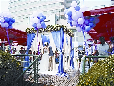 记者看到了不少结婚现场的照片,婚礼在露天的会场举行,场地大概可以容纳100个人左右,西式自助餐。现场布置以白色和淡紫色为主,新郎彭坦穿着黑色西装和蓝格子裤,而新娘春晓的一袭白色婚纱别具匠心,背后是一个“囍”字。记者询问了一些武汉与彭坦相熟的朋友,大家纷纷表示只是在开心网上看到转帖,才知道彭坦回汉结婚的消息,估计他请的都是家里的亲戚朋友。