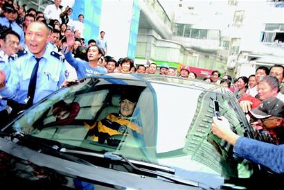 王家卫这时还来医院探望,难道赵本山暂时不能出院?百余位记者和粉丝不免心生疑问,不过他们并未离去,一直等到下午3点27分,人群突然骚动,夹杂着欢呼声:“赵本山出来了!”果然,身穿黄黑条纹T恤的赵本山精神抖擞地亮相了,他面色红润,不断向记者、医生挥手、握手,人群中“噼里啪啦”地响起掌声,恭贺本山大叔恢复健康。由于围观的人太多,坐上小车后,赵本山也没能马上离开现场,他不得不摇下原本关闭的车窗,一一感谢告别,车子才缓缓驶离医院。