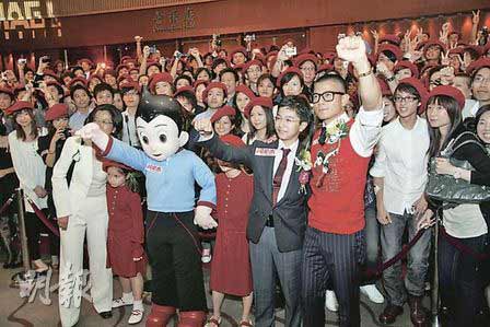 “明报”消息,城城与吴澋滔声演的动画《阿童木》前晚举行首映,漫画家手冢治虫儿子手冢真专程来港捧场外,有份参与动画制作的400位香港动画师亦助阵,“最美丽港姐”朱玲玲和夫婿罗康瑞、张可颐等均同来欣赏,凝聚一片热闹气氛。主角城城和吴澋滔于首映开始前,以父子档拖手进场,城城穿着印有阿童木肖像的鲜红背心配衬恤衫、西裤,添了几分青春感,长大不少的吴澋滔却穿西装配金丝眼镜,看来很老成。