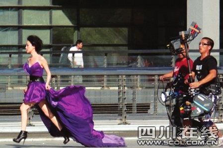 周迅穿紫色露肩短裙拍广告 蹬十寸高跟鞋风中狂奔(2)