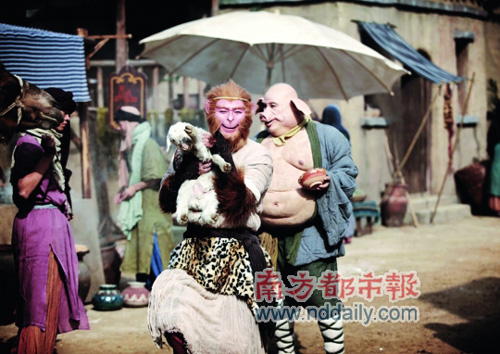 新《西游记》在冶力关拍摄的部分剧照昨日曝光,其中孙悟空的造型曝光尚属首次。从曝光的照片上可以看出,孙悟空的造型细节非常逼真,身上毛发纤毫毕现,但悟空却长了一个“鹰钩鼻”,有些神似去世天王“杰克逊”。