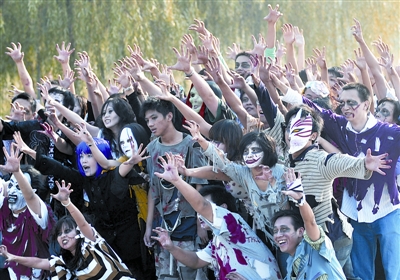 昨日上午,70余名迈克尔·杰克逊武汉歌迷,扮成不同僵尸造型在汉口江滩二桥处跳起这位巨星的经典作品——“Thriller(颤栗)”,他们着装恐怖,舞姿怪异,引来众多市民观看。