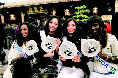 对更多的佳丽来说,组委会安排的在三义庙前学蜀绣,真是一个有意思的“功课”,“教科书”是一幅绣着正在吃竹子的熊猫的蜀绣,只见佳丽们穿针引线,五彩丝线化作了她们的名字。不过她们没有一位敢绣熊猫,因为“太难了”,她们还不停地猜测这样一幅蜀绣要绣一个月,还是10多天。当得知只需要4天左右的时间,她们看着和头发丝一样细的真丝丝线,不可思议地连连感叹:川妹子真是心灵手巧!澳大利亚小姐告诉记者:“我学习过缝纫和刺绣,我知道刺绣非常考验一个人的耐心和恒心,有很多人坚持不了就半途而废了。我很佩服成都姑娘!”