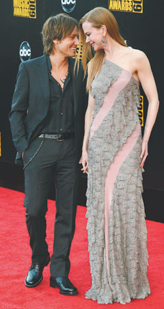 当日,妮可基德曼又穿了她最爱的Balenciage长礼服,单肩、斜裁、用蕾丝手工缝制出美人鱼鳞片的装饰,把最in的元素全凑在身上,偏偏侧梳的金发不听话,动不动就垂下来,遮得妮可成了“半脸美人”。