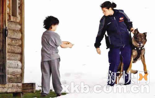 波兰斯基的9岁儿子Elvis走出屋外跟其中一名女警交谈