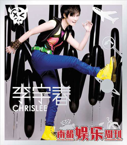《李宇春》2009.11.16 李宇春不仅化上了黑色和蓝色的烟熏妆眼妆,在 服装上也以亮黄、亮黑、蓝色、绿色等撞色系为主色调,令整组造型颇具视觉冲击力的同时也大胆地突破了李宇春以往的造型风格。