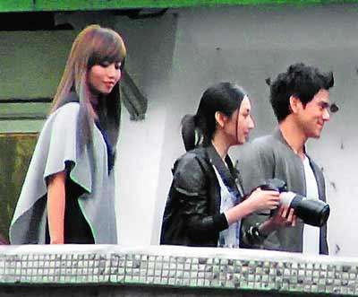 彭于晏(右起)和柯佳嬿昨帮A-Lin跨刀拍MV。