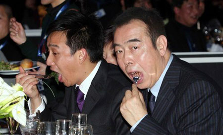 中新网12月17日电 据“凤凰网”消息,16日,某品牌2009年度盛宴举行。五对演艺圈模范夫妻现身,分别包括甄子丹和汪诗诗、张智霖和袁咏仪、黄磊和孙莉、陈凯歌和陈红、董洁和潘粤明。大家齐聚一堂,现场大斗甜蜜幸福。陈凯歌和陈红现场领衔五对夫妻亮相,气势十足。晚餐时,众明星面对眼前的美食不禁大快朵颐起来,把形象抛到脑后,吃相雷人。
