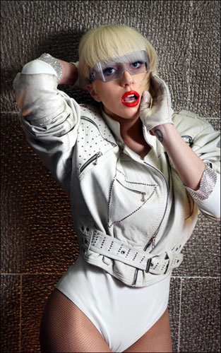 这些照片出自著名摄影师埃拉·佩里格里尼(Ella Pellegrini)之手,照片中这位《Just Dance》女主角身穿装饰了大量拉链的白色裁减皮革夹克,白色紧身短裤,渔网长袜和高跟系带靴。