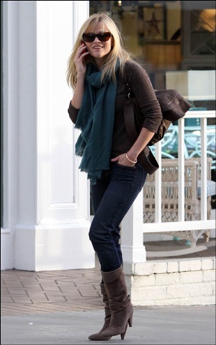 瑞茜·威瑟斯彭因为出演了那位永远满身粉色的俏律师而走红,但是现实生活中的她反而喜欢素净淡雅的颜色,简单的咖啡色毛衣配上了咖啡色的背包和咖啡色的靴子,孔雀蓝的围巾,搭配的相得益彰,熟女的独特风韵一览无遗。
