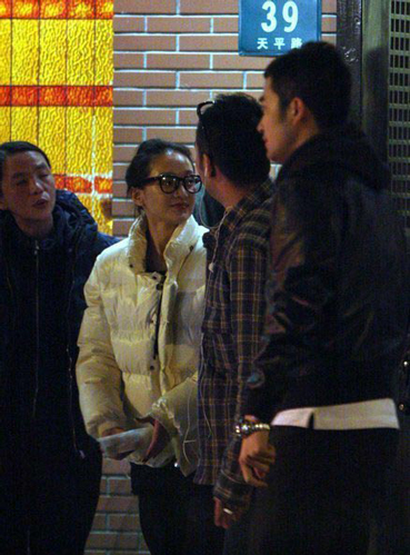 身穿白色羽绒服的周迅,素面朝天,戴着一副夸张的哈利波特式的黑框大眼镜,显得非常“引人注目”。
