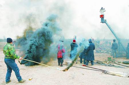 拍摄现场:黑烟滚滚,焰火点燃草地