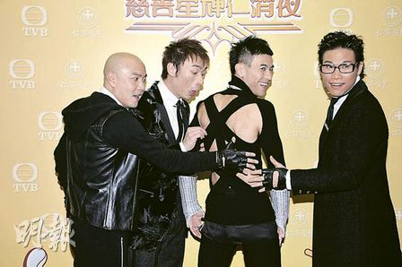 张卫健、许志安与苏永康都对梁汉文的露背装感到好奇。