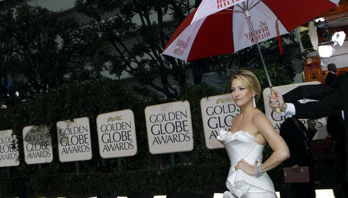 凯特.哈德森(Kate Husdon)亮相金球奖红毯,有专人撑伞气派十足。