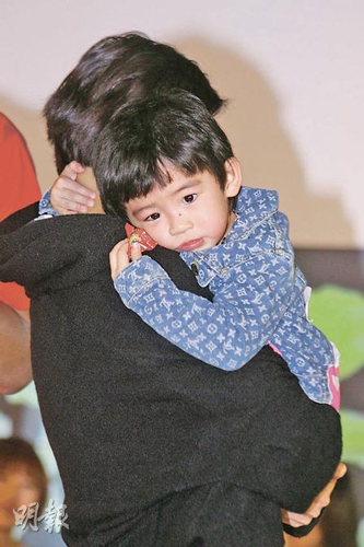 手持糖果的Lucas由工作人员带上台,现场300个歌迷实时起哄,加上传媒的闪光灯闪不停,吓得Lucas“哗”一声后便大哭起来,工作人员与柏芝助手实时抱起他安慰。现场展出10幅由余文乐 亲自操刀的香港艺人黑白照片,其中一张是谢霆锋,Luscas见到霆锋的巨型照片实时睁大眼看了看,更主动向大家挥手,非常可爱。