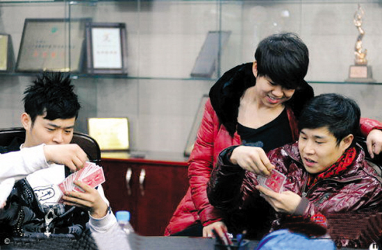 媳妇陪小沈阳(右)在后台悠闲地打牌