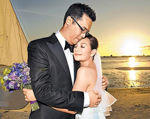 台湾《苹果日报》消息称,这场梦幻沙滩婚礼,不仅有白色珠帘纱门、走向沙滩的红毯旁的紫色花台,海上还有两艘在帆上写着两人英文名字“Tony&Fish”的白色帆船当背景。