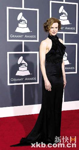 如果说在电影的颁奖礼上,妮可绝对是掌门人;但是要是在音乐的颁奖礼上,专门前来为老公捧场的她就不得退居到碧昂斯后面。这次的黑色高领曳地裙,低调中显示出高雅和古典,与她金红色的盘发和白皙的肤色非常搭配。
