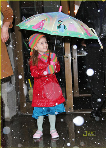 阿汤嫂与爱女苏瑞于当地时间2月10日外出。当天纽约下着小雪,母女二人仍冒雪外出,小苏瑞还特意撑了一把印有热映动画片《公主与青蛙》形象的雨伞,穿着红色棉衣,带着彩色条纹的帽子、围巾、手套,宛若公主一般。然而苏瑞也开始像大明星一样躲避狗仔的拍摄,一会用小手捂住脸,一会又压低卡通伞遮挡,还不小心踏进污水中。