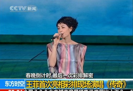 报道指,此次王菲录制《传奇》,一共唱了四遍,歌声非常空灵动听;王菲身边有六个工作人员,但虽然临近佳节,丈夫李亚鹏并没有陪伴身边。