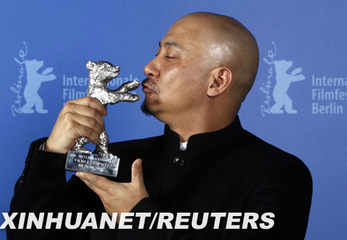 中国导演王全安亲吻银熊奖奖杯。