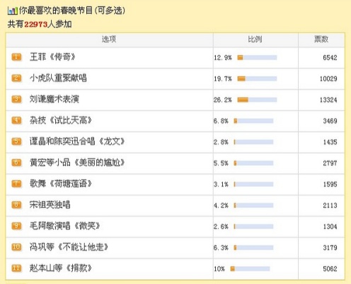 相比刘谦,王菲显得低调很多,选择央视春晚作为复出首站的王菲被指“假唱”,但尽管被网友详细列举了“假唱”的种种证据,但仍凭借天后实力喜获12.9%的网友力挺。而王菲的好友,《传奇》的原唱李健更公开力证王菲并未假唱,李健表示“王菲最不喜欢的就是假唱,她有真唱的实力”。