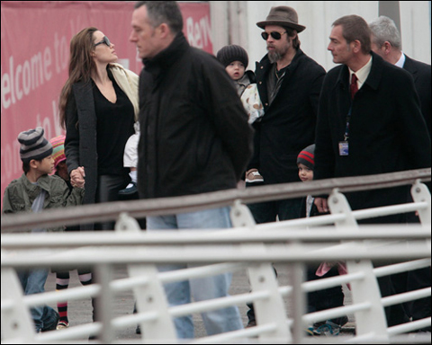 皮特茱莉带龙凤胎外出 小女儿顶毛球帽惹人爱(图)(4)