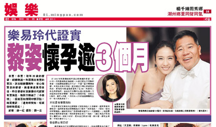 虽然乐易玲不肯透露黎姿究竟怀孕多久,但她透露现在已过了“小器期”,换言之起码怀孕3个月以上。再问到乐易玲,大了肚的黎姿是否很开心?她即说:“当然开心啦!”有在场记者笑指乐小姐连黎姿是否怀龙凤胎都不知,似乎无face(面子)?她只笑说:“我一向都无face啦!”