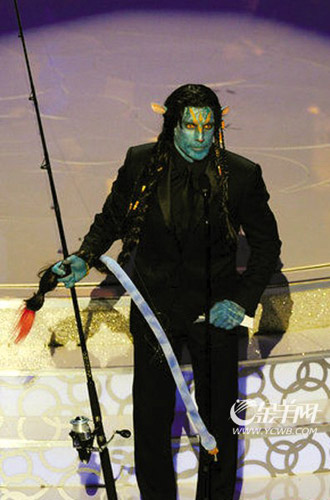 颁发最佳化妆奖的本·斯蒂勒以《阿凡达》中的外星土著形象登台