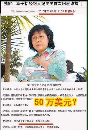 网友疑惑:为何章小姐在将近两年的时间里,无论是在接受媒体的采访还是接受N多慈善大奖时,都没有向大家澄清这100万美元是莫须有的,实际金额只有4万美元呢。章小姐您不可能不知道各大媒体当时对您的相关报道吧。