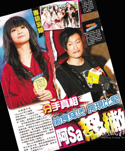 据报道,去年,担任无线综艺节目《美女厨房》主持人的郑中基,与节目中的美女助理“厨房天使”们越玩越过火。喜欢摄影的他,经常相约“天使”拍摄三点式性感照,其后被阿Sa发现他房中竟然藏有比基尼,而该物品的主人被指是先后迷倒节目监制钱国伟、艺人李思捷的“中年男人杀手”春卷(王宝宝)。据说,阿Sa因此怒甩郑中基。大半年来,男方继续死缠烂打,最近还私放婚讯想逼迫阿Sa就范,没想到惹来阿Sa的强烈反弹,上周三(3月17日)索性在北京出席《美丽密令》记者会时公开宣布分手,以断绝男方的念头。