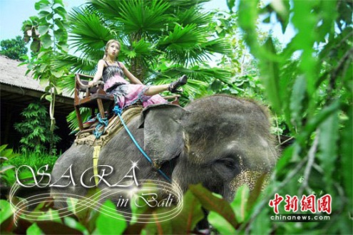 SARA变身丛林女王与象共舞 撩长裙晒修长美腿(图)(2)